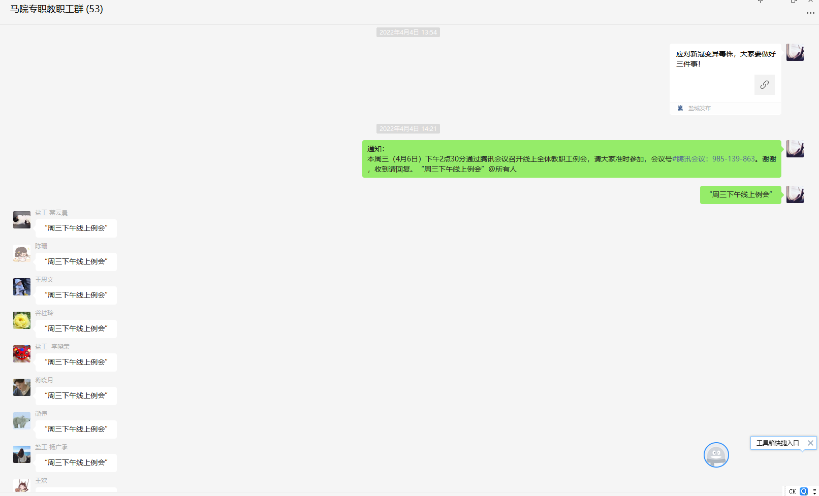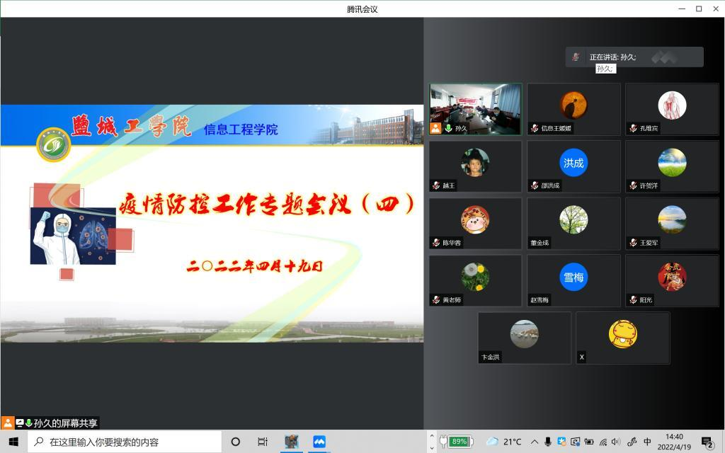 4月10日,因疫情防控形势严峻,学校实行封闭管理。学院党总支决定杨汉华、刘文方两位同志住校工作,仇乃民同志负责校外管理。在此期间,充分利用信息化平台,第一时间传达学校疫情防控精神,部署学院疫情防控工作。每天上午和晚上召开疫情防控工作领导小组会议,布置、传达和总结当天的疫情防控工作和教学等工作。