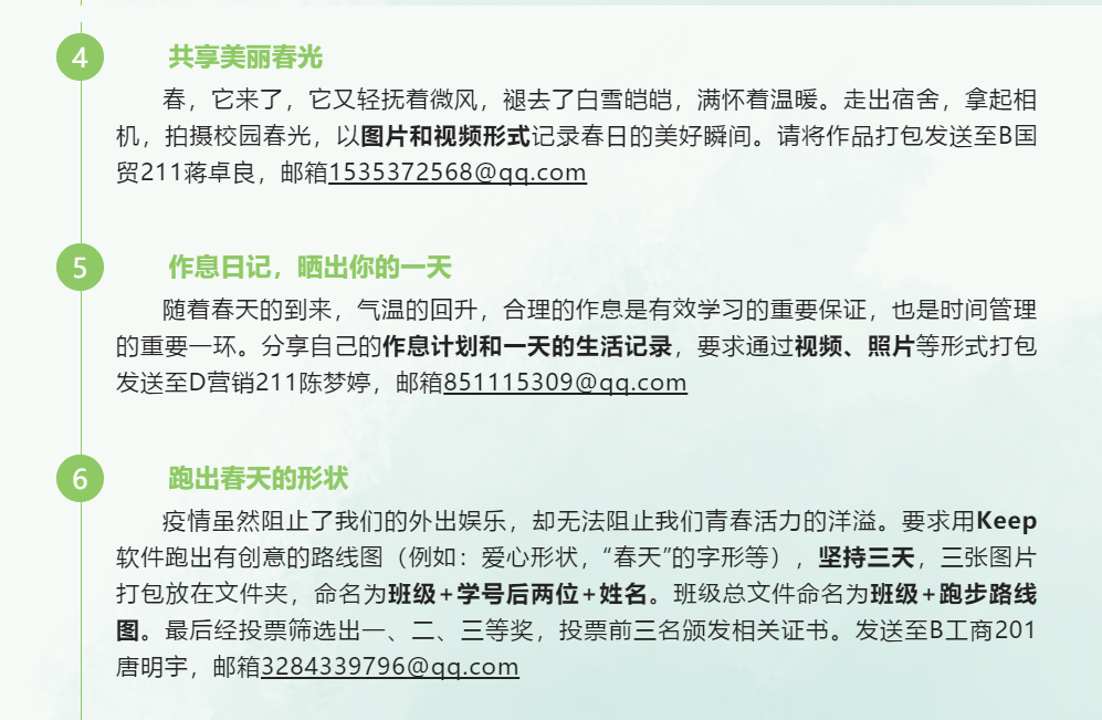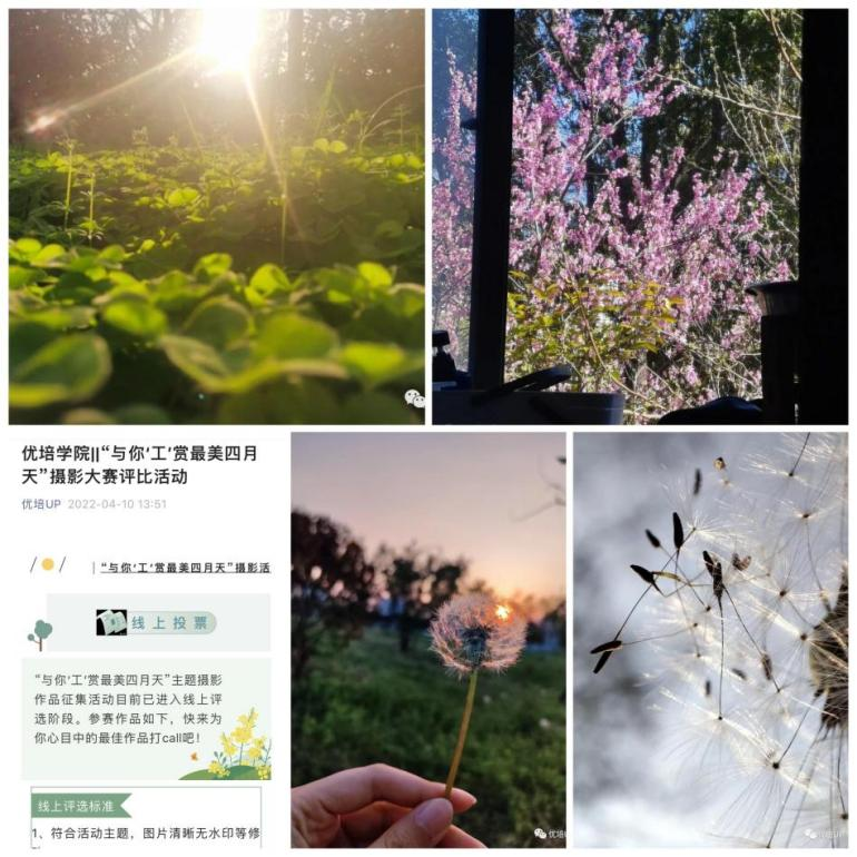 举办“寻找盐工最美春天”摄影比赛,鼓励同学们以独特的视角去记录校园里每一面动人风景,去定格最美春日景色,去发现优秀的自己和身边的美好。