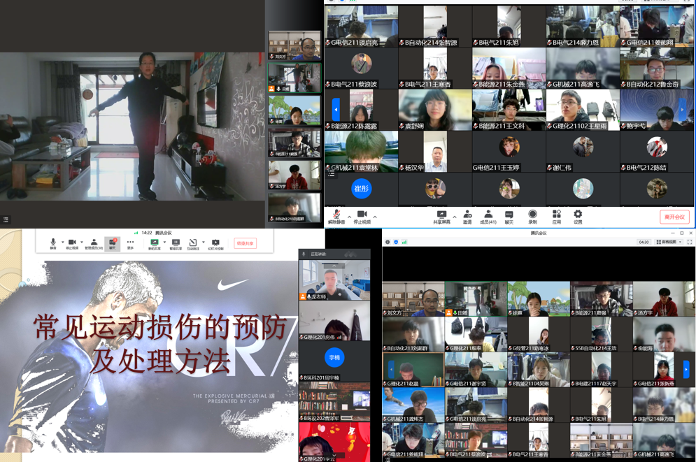 学院迅速启动应急预案,各教研部及时调整教学方案,梳理适合疫情防控要求的教学内容和视频资源,线上体育教学覆盖266个教学班,共21个运动专项,包括球类、拳操类、舞蹈类、器械类等运动项目。线上教学中,任课老师根据在线教学指导意见和疫情防控实际情况,不断挖掘和丰富教学资源和教学形式,严格把控教学内容质量,充分利用腾讯会议平台和班级微信群开展教学、指导和答疑,帮助学生在疫情防控期间通过适量科学锻炼保持身体状态、缓解压力。