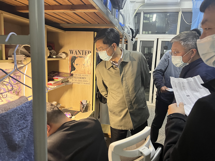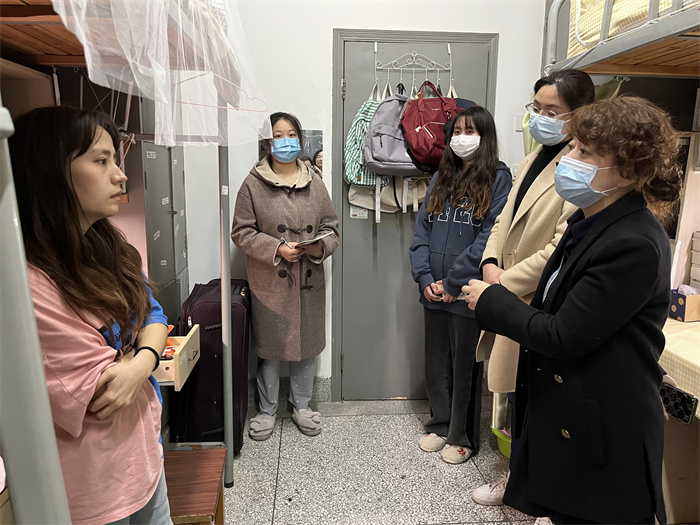 同时,学院的驻校老师走访学生宿舍,详细了解学生们的网课学习情况、宿舍卫生和封校后校园生活的感受,让同学们深切感受到家的温暖和学院的关怀。在2018级毕业生宿舍,院长吴发红了解了学生在考研、考编、考证等方面的具体情况,亲身指导毕业生就业工作,鼓励同学们在疫情之下,积极利用网络平台线上应聘工作,多关注招生就业的相关网站,多渠道了解招聘公告,多投应聘简历,提前准备,争取早日实现顺利就业。学院党委书记谷伟叮嘱同学们要严格遵守疫情防控期间校园管理要求,做好疫情防控常态化下的自我管理和个人防护,保持宿舍通风和干净整洁,营造安全、卫生且和谐的宿舍氛围。此外,学院老师们利用线上模式,加强对大四学生的毕业设计指导工作,解答疑难困惑,帮助毕业生顺利毕业。