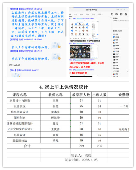 为保证疫情防控期间线上教学质量,学院领导班子成员高度重视,召开教学工作专题会议,启动教学预案,学院党总支要求全体教职工要充分认识到教学工作在学生管理中的“压舱石”作用,发挥课程思政的思想引领作用,共同担起学院教学和日常管理责任。每位任课老师认真按照学院要求,利用腾讯会议、钉钉等在线平台,通过课前签到、师生互动和现场答疑等多种方式,千方百计保障线上教学质量,确保线上课程高质量完成。
