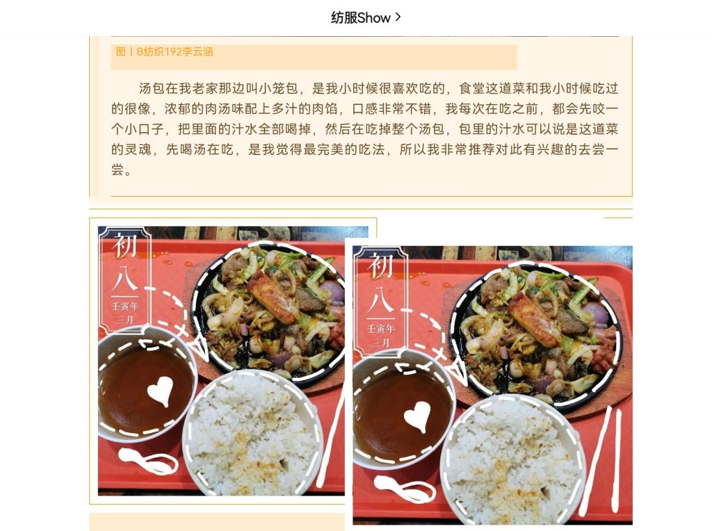 为了丰富校园文化生活,提高同学们参与社会实践积极性,加强同学之间的交流和沟通。纺织服装学院团委推出了“了解校园美食,感悟百味人生”盐工美食打卡活动。纺服学院全体学生参赛,采取线上投稿方式,宣传校园美食文化。活动过程中,同学们积极主动的参加活动,拍摄并介绍自己喜欢的校园美食。