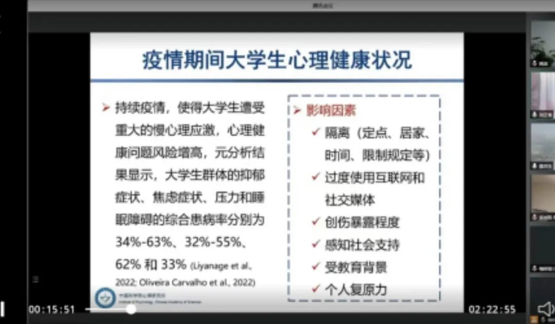 封校期间,大学生校园生活还是略显乏味的。适时关注学生心理健康,缓解学生对学习、未来多方面的焦虑,释放对疫情发展的不理性的恐惧,学院党政高度重视做好学生心健工作,强调封校不停学,封校不封爱。驻校领导和老师在多个场合下都表示要积极关爱学生心理健康,并利用云端会议、宿舍走访、和重点关注学生交流等方式,给学生做“团辅”和“单辅”,指导学生自我调节心理。2022年4月9-10日期间,学院组织学校各班级心理委员线上观看“抗击疫情全国心理委员大讲堂”系列线上公益讲座,并就讲座心得组织线上研讨。