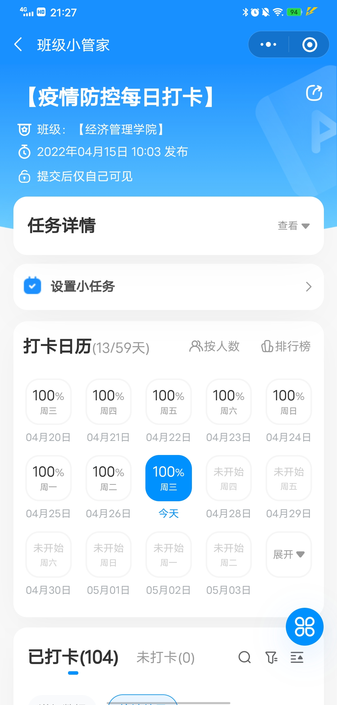 做实摸底排查,确保排除隐患,做到疫情防控全覆盖。学院党政办公室负责每天上午10:00前上报学院全体教职工防疫基本信息,提醒全体教职工每天按时进行健康申报。