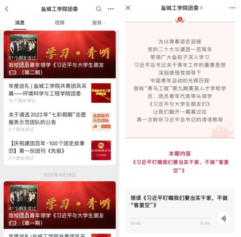自4月29日起,我校学生会在“盐城工学院团委”新媒体平台开展“团员青年领学《习近平与大学生朋友们》”新媒体栏目。每期邀请我校各级青马工程学员、团员青年代表带头领学《习近平与大学生朋友们》,带领广大盐粒子深入学习习近平总书记关于青年工作的重要思想,深刻领会我党领导下中国青年运动的光辉历程。截至目前,本栏目已开展6期,邀请20余名学生代表参与领学,在同学中引起热烈反响。