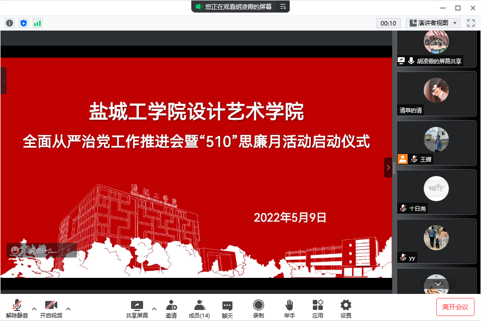 5月9日下午,设计艺术学院在线上举行全面从严治党工作推进会暨“510”思廉月活动启动仪式,学院党总支书记胡凌霞主持,学院领导班子成员、党支部书记、各科室、专业系、实验中心主任参加会议。