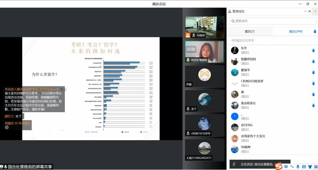 雷雅茹从毕业生考研、考公、就业等毕业去向的选择出发,通过列举详实数据全面分析了当前疫情形势下考公考编考研的难度,在此基础上对我校出国(境)留学项目进行重点讲解。她指出,出国留学要早做安排,大学生需在语言、学术、文化、生活能力、未来职业、资金等六个方面做充分准备。会上,她为学生及家长详细介绍我校与英国格林威治大学、美国底特律大学、波兰格但斯克技术大学等十所世界名校的留学项目及其申请条件,为学生及家长们答疑解惑。