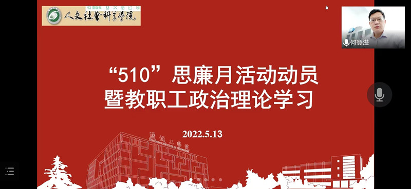 为深入贯彻落实全面从严治党要求,进一步推动党员干部和广大教师增强廉洁自律意识,筑牢廉洁从业、廉洁从教思想防线,推动全院政治生态持续优化。5月13日下午,人文学院举行“510”思廉月活动动员暨教职工政治理论学习。会议由学院党总支书记何登溢主持,学院全体教职工线上参加。