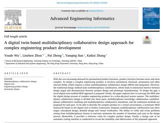 近日,机械优集学院2019级专业学位硕士研究生吴有德在国际知名学术期刊《Advanced Engineering Informatics》上发表题为“A digital twin-based multidisciplinary collaborative design approach for complex engineering product development”的研究论文。吴有德为第一作者,盐城工学院为第一单位,校内导师周临震教授为通讯作者,其合作导师是香港理工大学的郑湃教授。本研究得到了江苏省政策引导港澳台科技合作项目的支持。