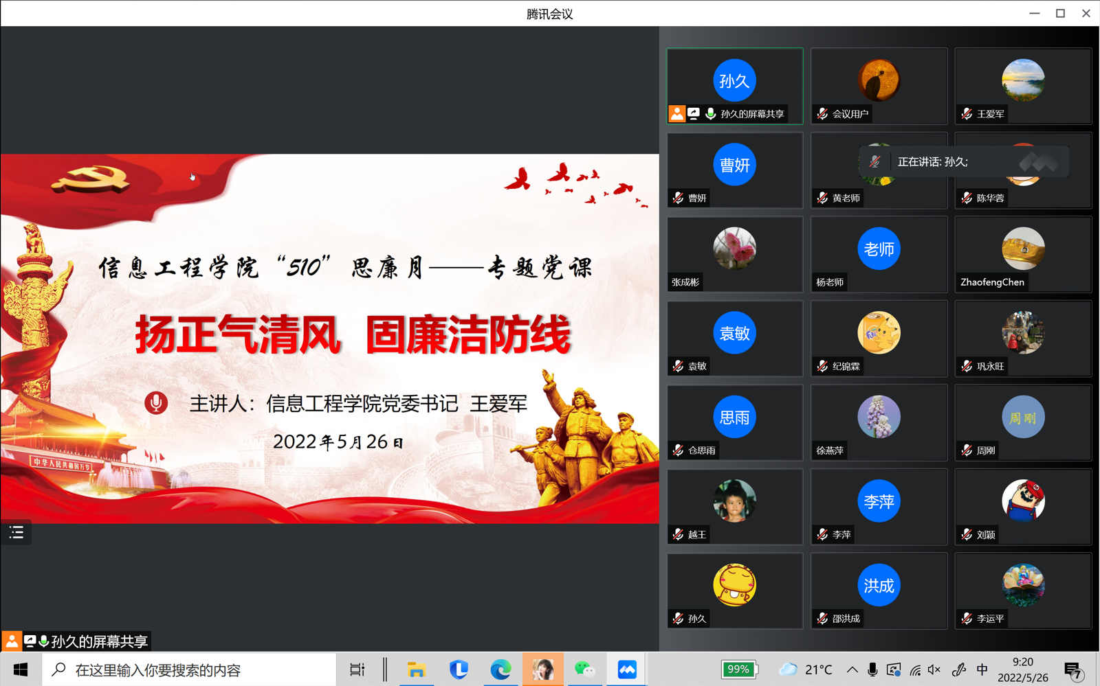 5月26日上午,信息工程学院开展“510”思廉月学习教育活动。学院党委书记王爱军作题为《扬清风正气 守廉洁初心》的专题党课报告,全体党员和中心组成员线上或线下参加了学习活动。