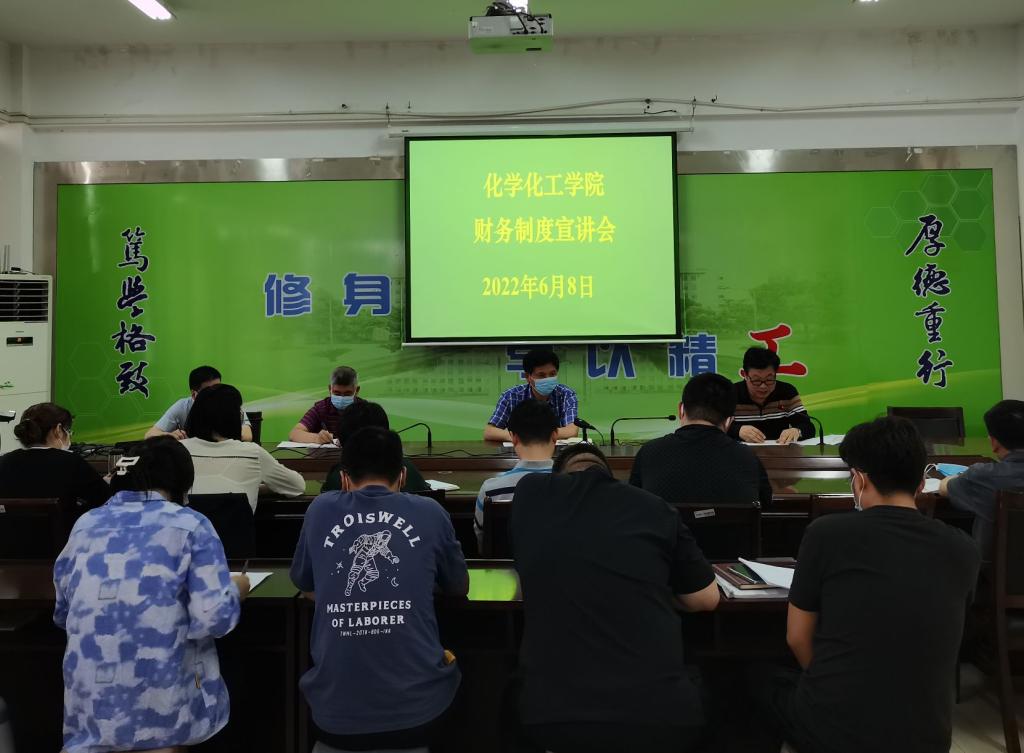 6月8日下午,化学化工学院在学院201会议室开展财务制度学习宣讲。学院党委书记高健主持会议,学院领导班子成员、各科室主任、各党支部书记和纪检委员、专业系主任等参会。