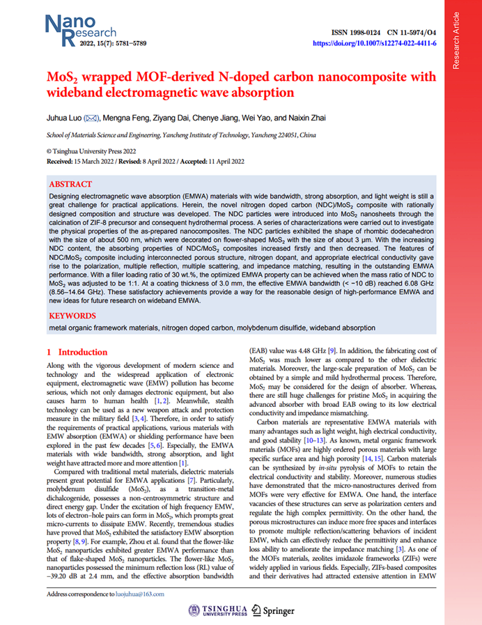 近日,材料学院罗驹华教授在材料领域顶级期刊Nano Research上发表题为“MoS2wrapped MOF-derived N-doped carbon nanocomposite with wideband electromagnetic wave absorption”的研究论文(Nano Research. 2022, 15 (7): 5781-5789, DOI:10.1007/s12274-022-4411-6)。