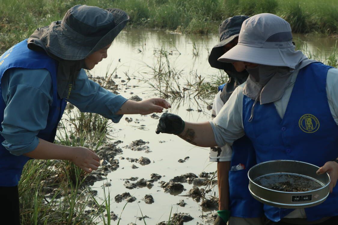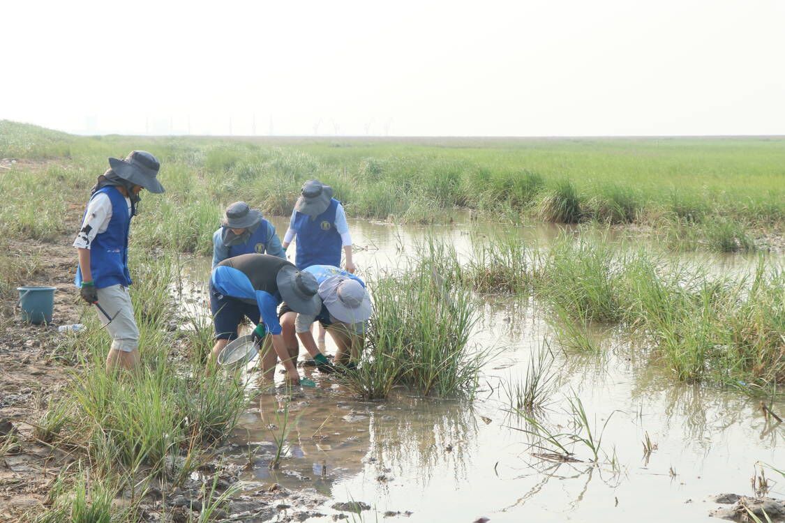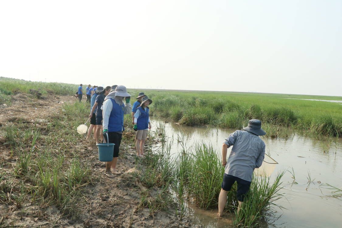 一到黄沙港,大家就全副武装了起来,撸起裤脚,带上防晒帽,拿起捕捞工具,走进了滩涂。隋老师向同学们介绍了滩涂的形成以及它的生态环境,并介绍了基本的捕捞方式。他提到盐城海岸线上有上千种的海洋底栖生物,如我们常见的螃蟹、沙蚕、海螺、鰕虎鱼等。在了解一些知识后,一行人带上自己的装备就向大海进军,B海洋202的瞿彬彬抄网就抓起了“跳跳鱼”。“跳跳鱼”学名又叫弹涂鱼,是虾虎鱼科、弹涂鱼属的一种鱼类。常依靠发达的胸肌柄匍匐或跳跃于滩涂上,退潮时在滩涂上觅食。其移动速度特别快,在海滩上犹如一个弹跳运动员,刚想动手去抓,它就已经跳远了。瞿彬彬来回挥网只捞起来一些水草,满头大汗却毫无收获。B生物202的韦轩见状过来帮忙,“彬彬,你在前面抓,我在后面堵。” “当你看见跳跳鱼的时候,你就已经抓不到它了。”齐志涛在一旁笑道。在老师的点拨下,同学们开始了一顿疯狂的“盲捕”操作,不看位置疯狂捕捞。第一轮捕捞过后,渔网里出现了两条“跳跳鱼”!“跳跳鱼”也被这种没有套路的捕捞法“弄昏了头”,乖乖束手就擒了。