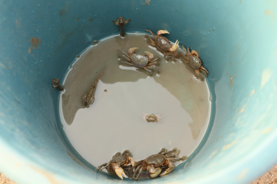 正值盛夏,海水还带着温热。同学们深一脚浅一脚走在海滩上,专注于海上的细小生物。“啊,又抓到了!”B生物212的严青云是专业的“螺蟹”收获者,一会的功夫就收获满满。细细长长的“中华拟蟹守螺”,小小红红的“绯拟沼螺”,还有数只会挥舞务着蟹钳的“天津厚蟹”,据说这可是做盐城醉蟹的原料。