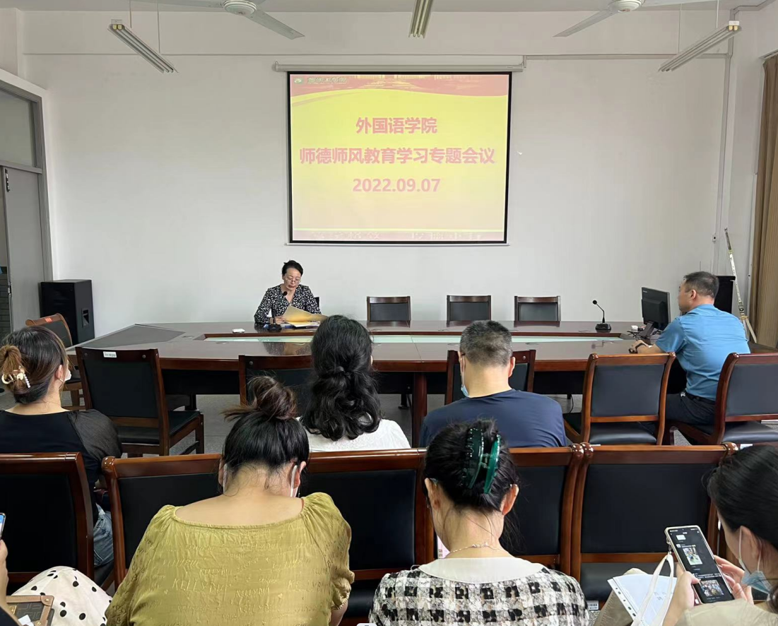 为了进一步加强外国语学院师德师风建设,提高教师职业道德修养,牢固“立德树人,教书育人”理念,9月7日下午,外国语学院在南校区润美楼A404会议室举行师德师风专题学习活动。会议由学院党总支书记谷文华主持,全院教职工参加。
