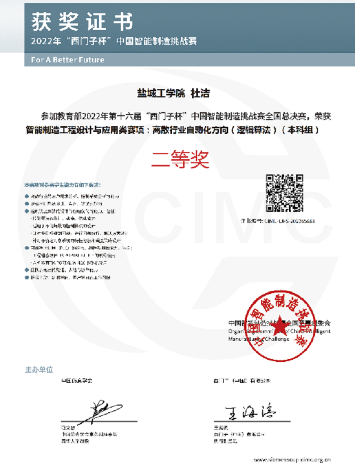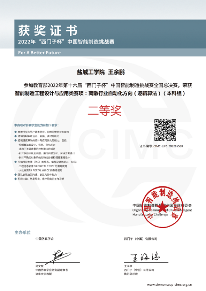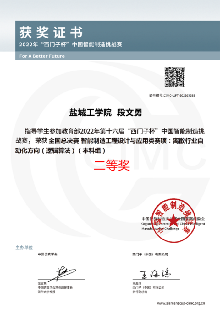 9月29日,第十六届“西门子杯”中国智能制造挑战赛全国总决赛闭幕式落下帷幕。我校电气工程学院杨晓冬、段文勇老师指导,张慕贤、王余鹏、杜洁同学组成的“盐工三小只”团队获得离散行业自动化(逻辑算法)方向的全国总决赛二等奖。