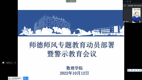 10月12日下午,数理学院线上召开师德师风专题教育动员部署暨警示教育会议,学院党总支书记魏伟华主持,学院全体教职工线上参加。