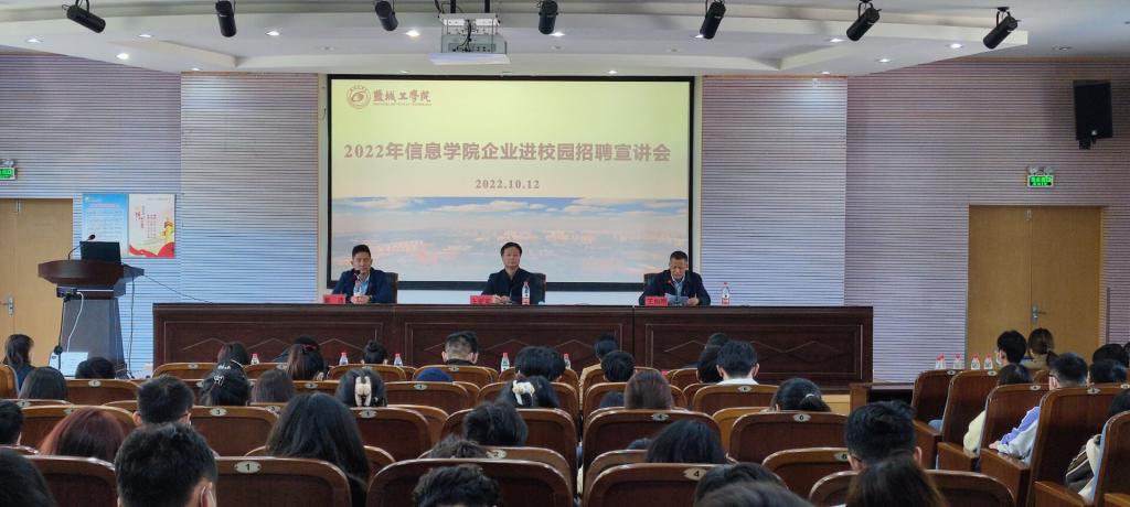 10月12日下午,信息学院在南校区土木馆报告厅举办企业进校园招聘宣讲会,立铠精密科技(盐城)有限公司、江苏省产业技术研究院高通量计算研究所、盐城维信电子有限公司、盐城东山通信技术有限公司、是石科技(江苏)有限公司等五家企业的10多位企业领导,信息学院党委书记王爱军、院长王如刚出席活动,党委副书记戴建主持,信息学院2019级本科生和2020级研究生等近200人参加会议。