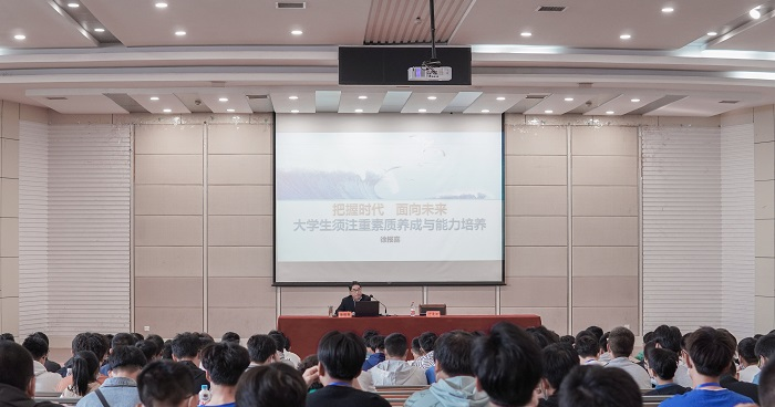 徐报喜指出大学生必须要注重素质养成与能力培养,为成为德智体美劳全面发展的社会主义建设者和接班人而努力奋斗。他希望同学们在大学学习时要牢记学习初衷,提高自我管理、自我约束能力,增强综合分析能力、人际协调能力、表达能力、信息真伪辨别能力、时间安排能力、创新创业能力。最后,他表示当代新青年生活在中国最好的时期,一定要珍惜时间,不断奋斗,成就自身,为党和国家的发展做出贡献。