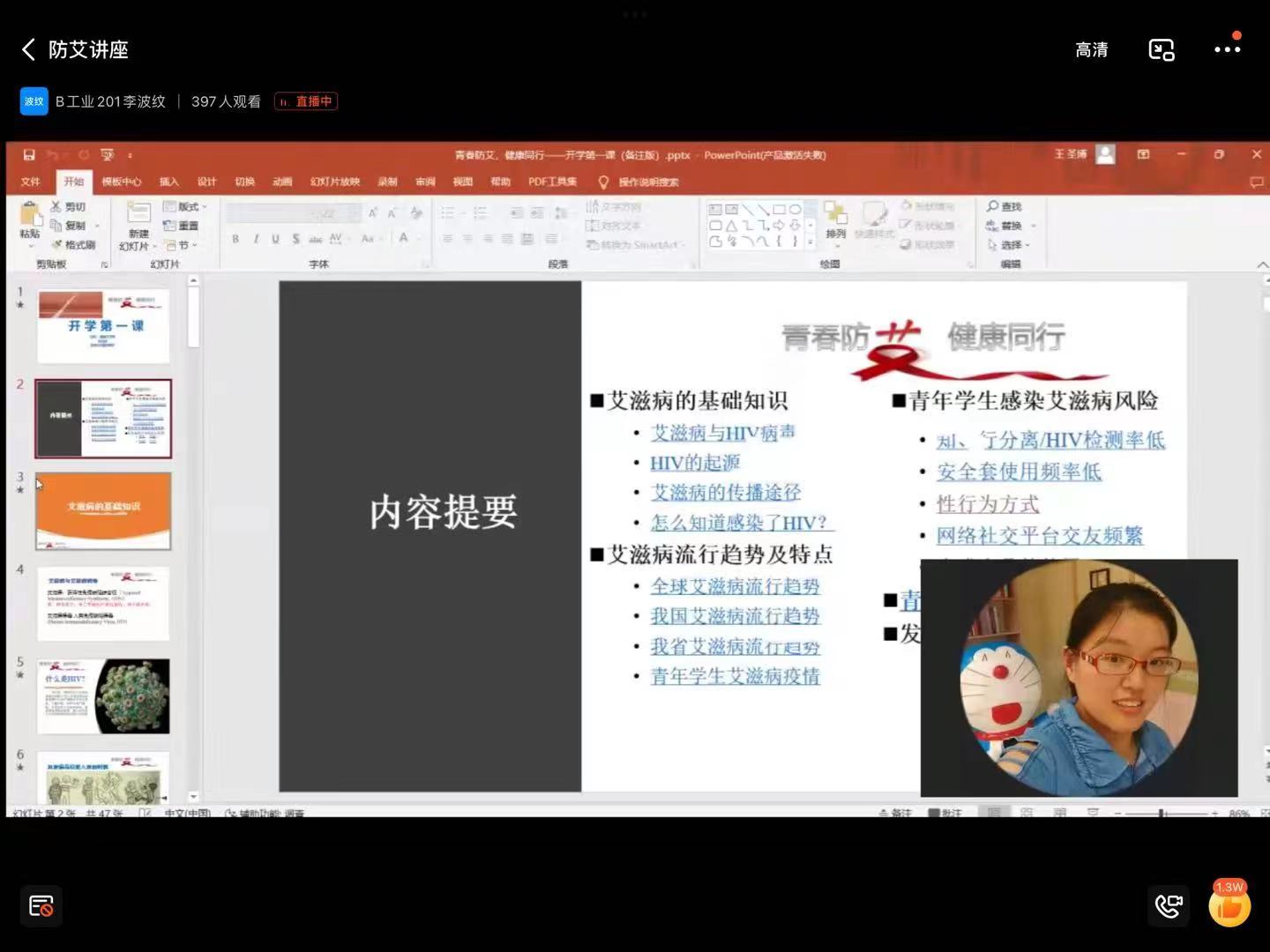 10月26日,由校团委主办、校“螺丝钉”青年志愿者协会承办的校园预防艾滋病知识讲座在钉钉会议线上举行,2022级500余名新生参加讲座。会议邀请校卫生所医师孙巧玲为同学们讲解如何预防艾滋病的相关知识。
