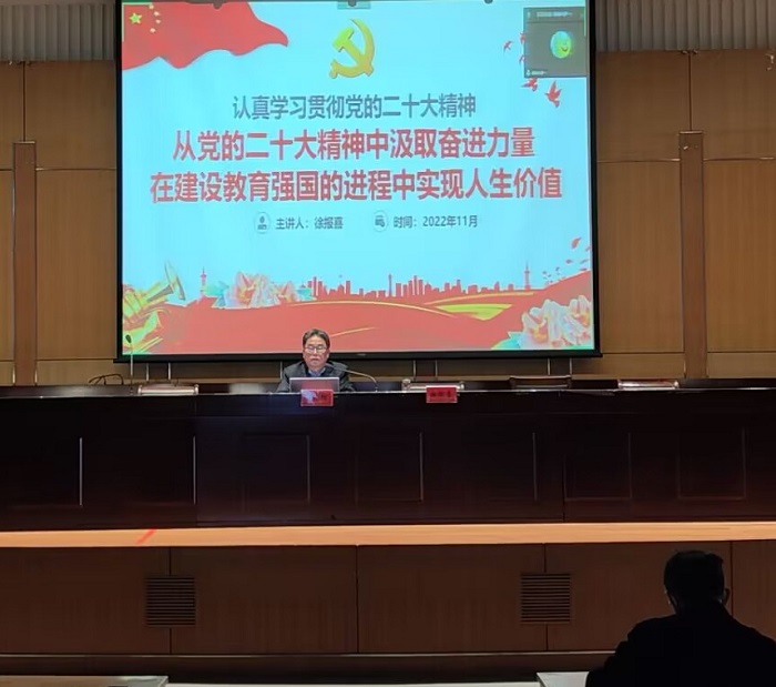 报告会上,徐报喜从对党和人民事业具有重大现实意义和深远历史意义的三件大事和伟大变革;奋力谱写马克思主义中国化时代化的新篇章;党的中心任务与中国式现代化;教师应努力成为德才兼备人才的缔造者四个方面内容为大家做了专题辅导。他指出,习总书记在大会上的报告求真务实,振奋人心,催人奋进,奏响了时代发展最强音,明确了今后五年乃至更长时间的发展大方向,尤其强调了实施科教兴国战略,强化现代化建设人才支撑,教师是立教之本,兴教之源,广大教师责任重大,使命光荣。我们要全面贯彻习近平新时代中国特色社会主义思想,坚守为党育人、为国育才的初心使命,以高质量教育助推科教兴国战略、人才强国战略、创新驱动发展战略。