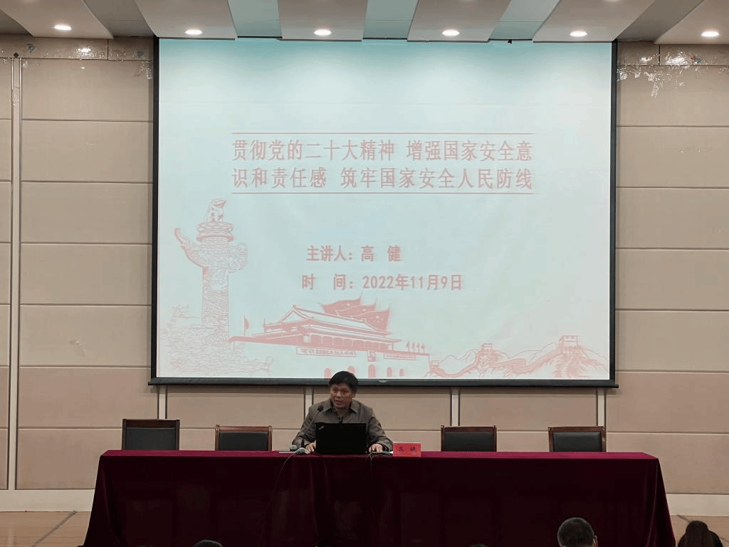 为了贯彻党的二十大精神,增强教职工国家安全意识和责任感,筑牢国家安全人民防线,11月9日下午,化学化工学院在化工楼报告厅开展国家安全宣传教育活动。活动由学院党委书记高健主持,学院全体教职工参加。