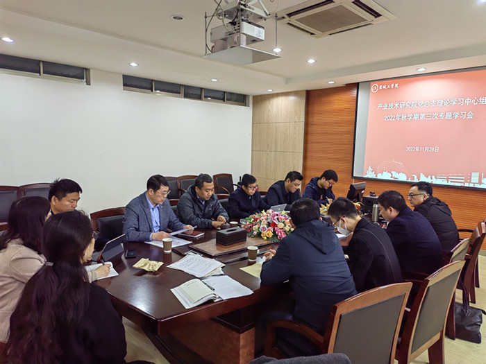 11月28日上午,产业技术研究院党总支理论学习中心组在北校区知达楼AE209会议室举行2022年秋学期第三次专题学习会,学习会由学院党总支书记、院长严金龙主持,学院党总支理论学习中心组成员参加。