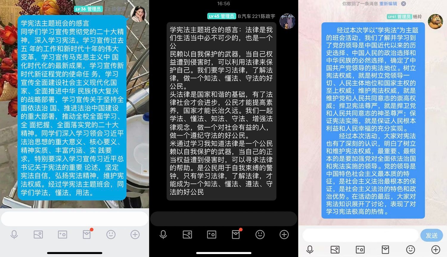 学院还通过新闻网站和公众号转发学习海报等形式引导师生学习宪法,学生自主观看了“宪法的精神 法治的力量——2022年度法治人物”特别节目,通过线上主题班会的形式带领学生学习了习近平法治思想。学生纷纷在班级群发表学习微感言。