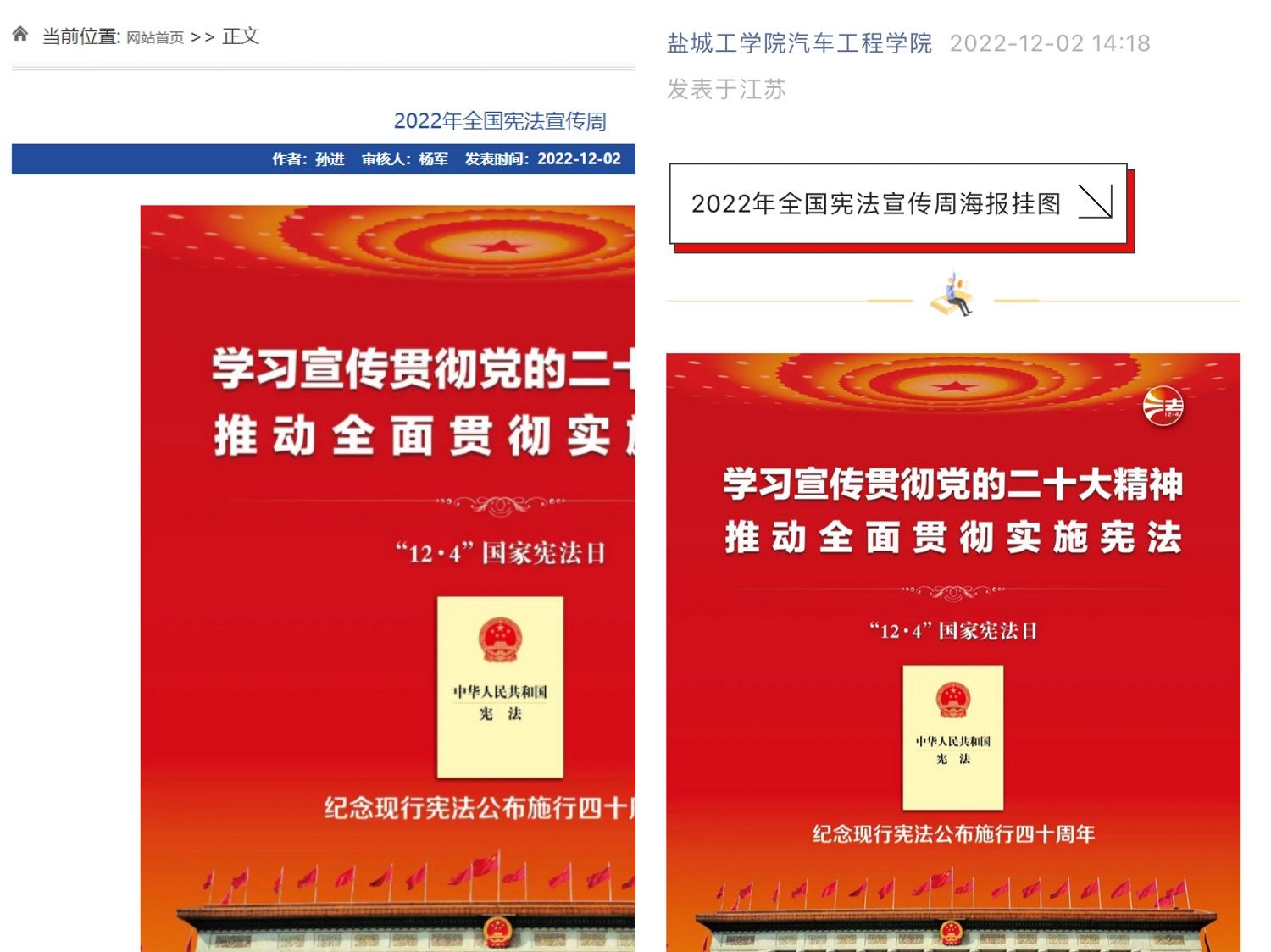 为深入贯彻落实党的二十大精神,学习宣传习近平法治思想,大力弘扬宪法精神,推动广大师生尊崇宪法、学习宪法、维护宪法、运用宪法,汽车工程学院积极组织开展以“学贯二十大,奋进新征程”为主题的宪法宣传周系列活动。