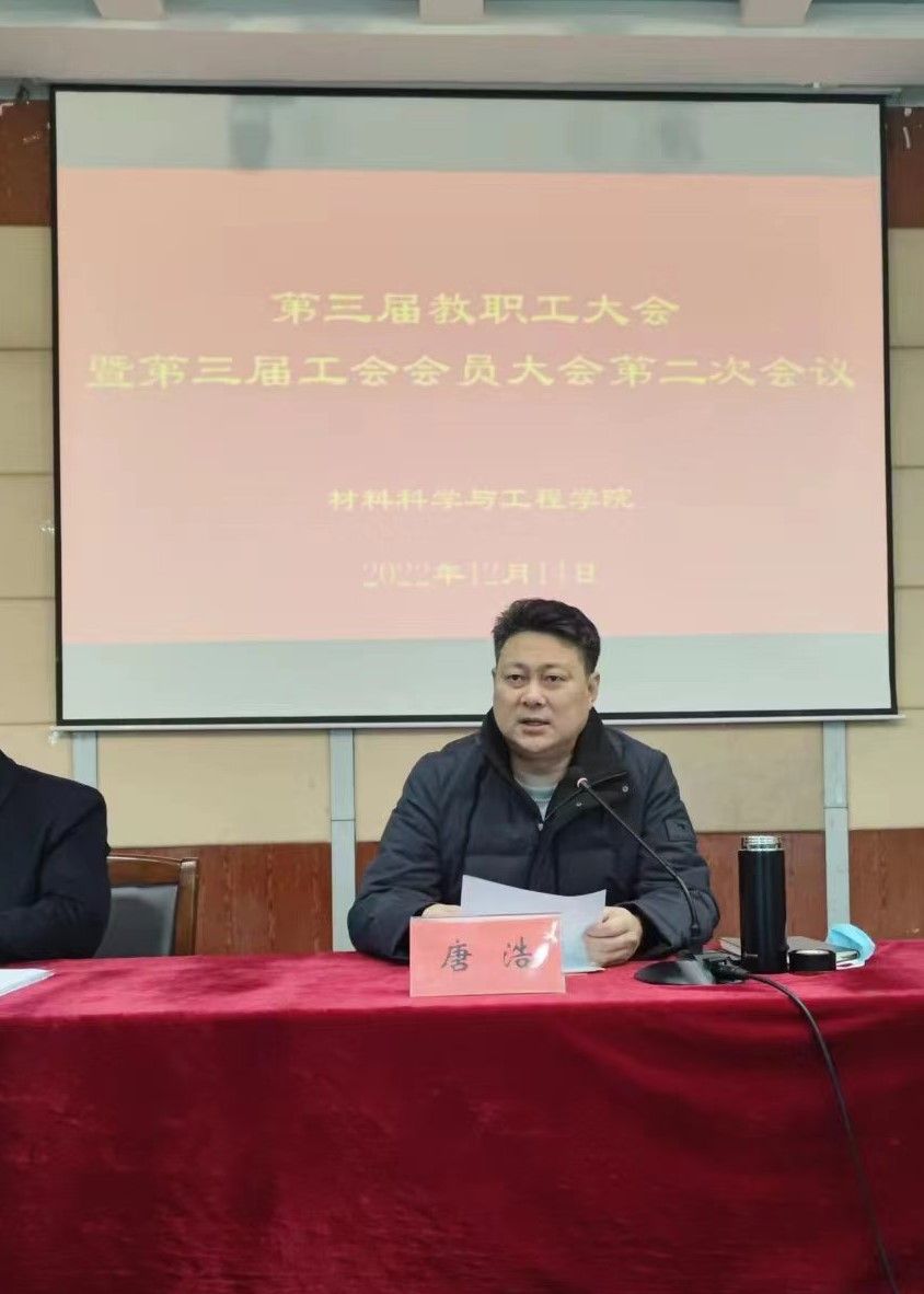 12月14日下午,材料学院在北校区五四报告厅召开第三届教职工大会暨第三届工会会员大会第二次会议。会议由学院党委书记唐浩主持,学院党政领导和全院教职工、工会会员参加。