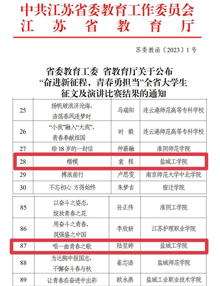 近日,省委教育工委、省教育厅发布《关于公布“奋进新征程,青春勇担当”全省大学生征文及演讲比赛结果的通知》,我校人文社会科学学院汉语言文学专业B中文211班袁程同学和环境科学与工程学院B环工201班陆翌婷同学分别获得一等奖、三等奖。