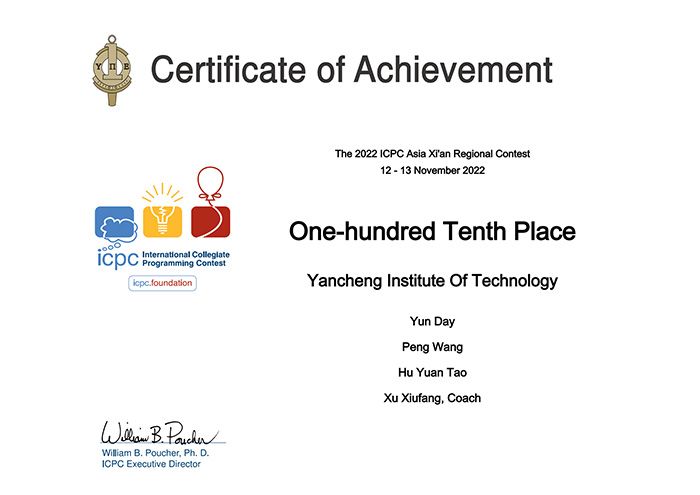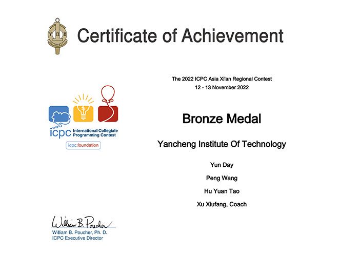 近日,第47届ICPC国际大学生程序设计竞赛亚洲区域赛(西安)结果公布,我校ICPC集训队员在徐秀芳、黄曙荣老师指导下积极备赛、奋力拼搏,最终信息工程学院胡远韬、戴赟、汪鹏组成的“盐工二队”代表队喜获铜奖,在比赛中解决六道编程题,取得“队伍排名186、学校排名110”的好成绩。该奖项在江苏省内同类高校中名列前茅,也是我校在ICPC国际大学生程序设计竞赛中首次获得奖牌。