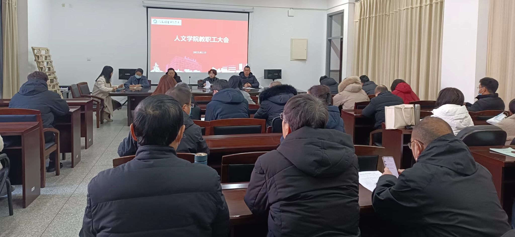 2月15日下午,在希望大道校区仁和楼A304会议室,人文学院召开春学期第一次教职工大会,回顾总结2022年工作,安排部署2023年重点工作任务。会议由院长周晓燕主持,全体教职工参加。