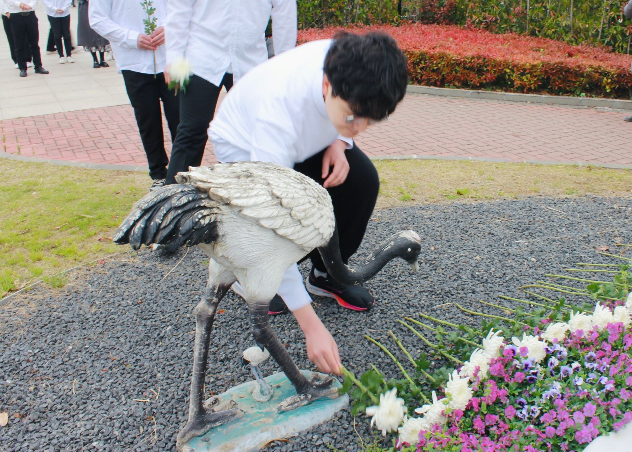 活动现场,全体师生向徐秀娟雕塑三鞠躬,依次走到徐秀娟纪念雕像前敬献鲜花并瞻仰纪念雕像,深情缅怀为驯鹤事业而献出年轻生命的徐秀娟烈士。志愿者代表孙鑫带领全体师生重温湿地保护志愿者誓词。神圣庄严的誓词,深深激励着在场的每一个人。