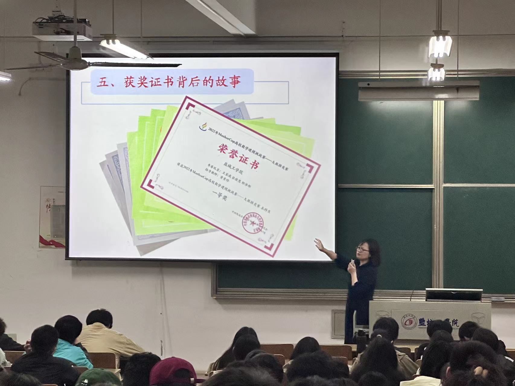 讲座中,黄素珍分别从“数学建模是什么”、“参加数学建模竞赛需要准备什么”、“参加数学建模竞赛有什么好处”、“获奖证书背后的故事”等几个方面展开讲述。详细介绍了数学建模的形式与难度,并结合自身指导学科竞赛的丰富经历,通过丰富的作品案例、图片,向学生们展示了学校在学科竞赛方面取得的优异成绩和优秀学长、学姐的励志成长故事,鼓励同学们积极参与到学科竞赛中来。