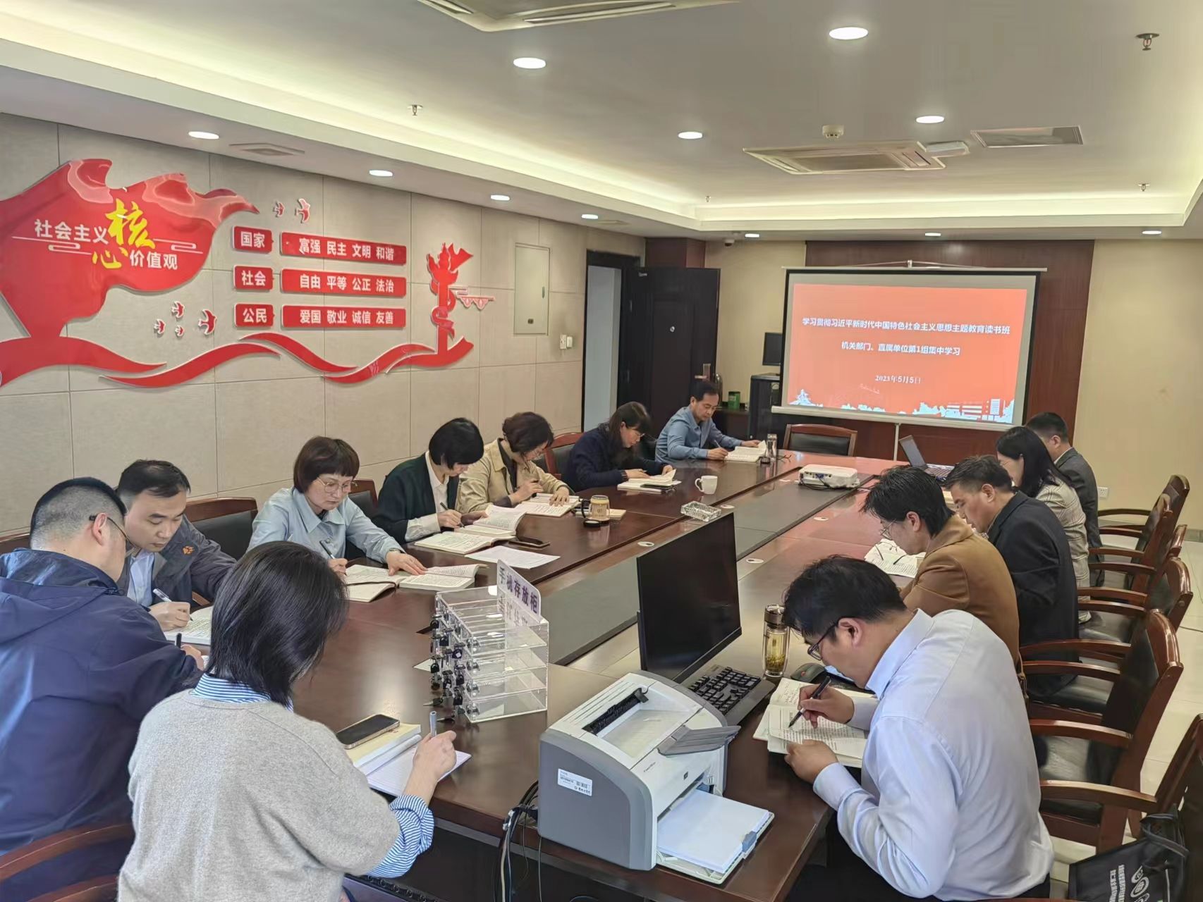 5月5日下午,在希望大道校行政楼630会议室,校学习贯彻习近平新时代中国特色社会主义思想主题教育读书班机关部门、直属单位第1组开展第三次集中学习研讨,重点学习《论党的自我革命》部分篇章。组长、人事处处长沈晓梅主持学习研讨会。校党委常委、宣传部长奚新国、纪委办公室主任陶应军旁听集体学习。