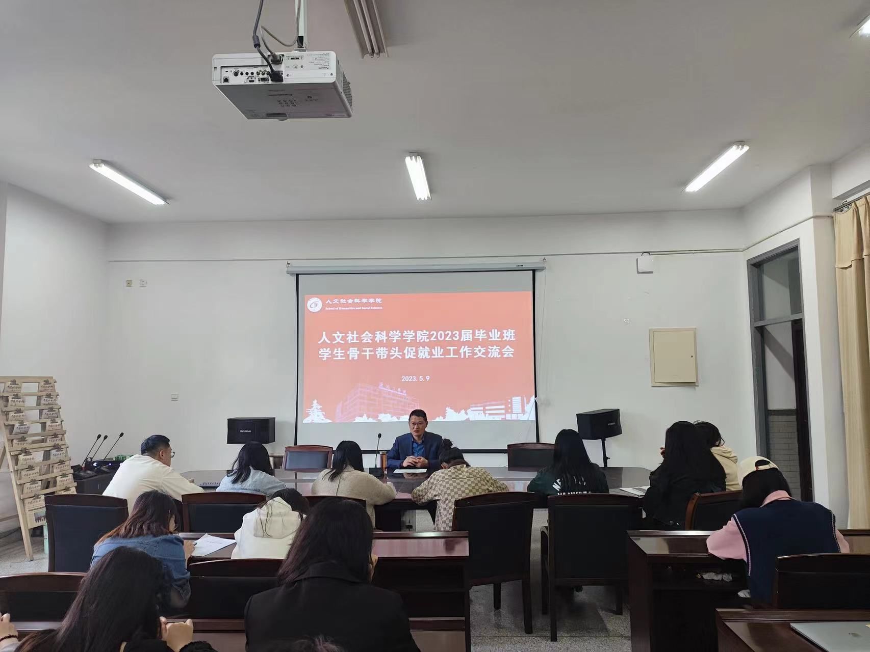 5月9日下午,在仁和楼A304会议室,人文学院召开2023届毕业班学生骨干带头促就业工作交流会。会议由学院党总支书记何登溢主持,毕业班学生党员和主要学生干部参加。