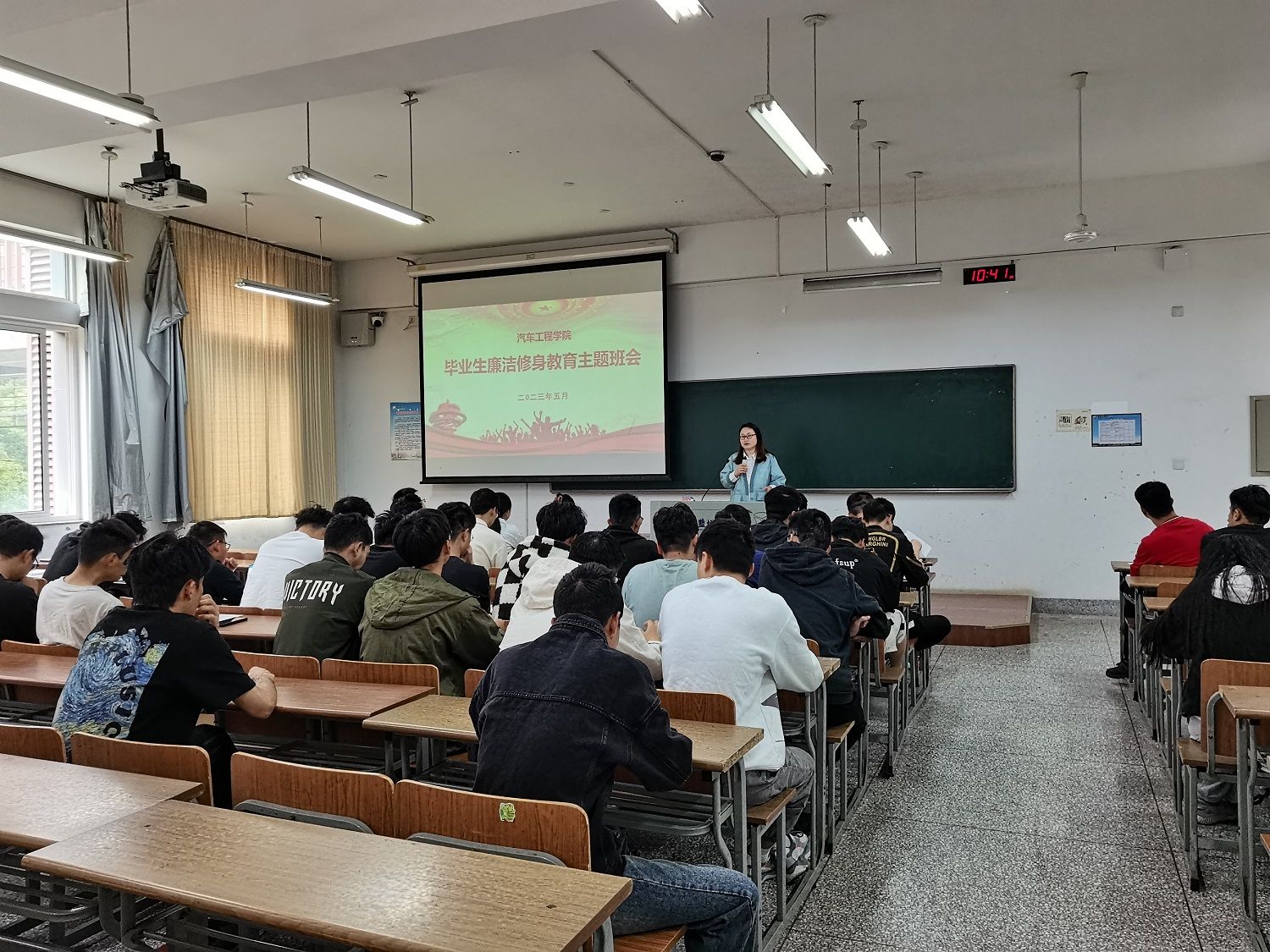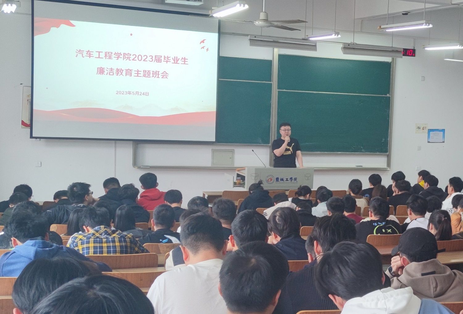 为推进学习贯彻习近平新时代中国特色社会主义思想主题教育走深走实,夯实毕业生清正廉洁思想根基,筑牢廉洁从业思想道德防线,5月24日,汽车工程学院在南校区博学楼举行了2023届毕业生廉洁教育活动,学院党总支副书记姜华和全体毕业班辅导员参加。