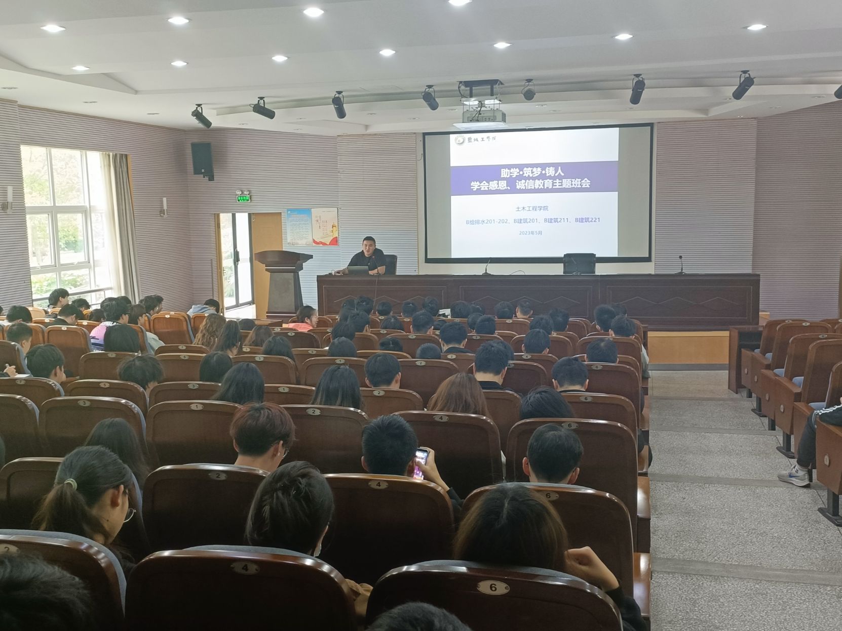 为不断塑造大学生的诚信与感恩品质,进一步推进大学生思想政治教育工作,5月23-25日,土木工程学院全体专兼职辅导员以责任班级为单位,分别在希望大道校区和建军东路校区召开学会感恩、诚信教育主题班会。