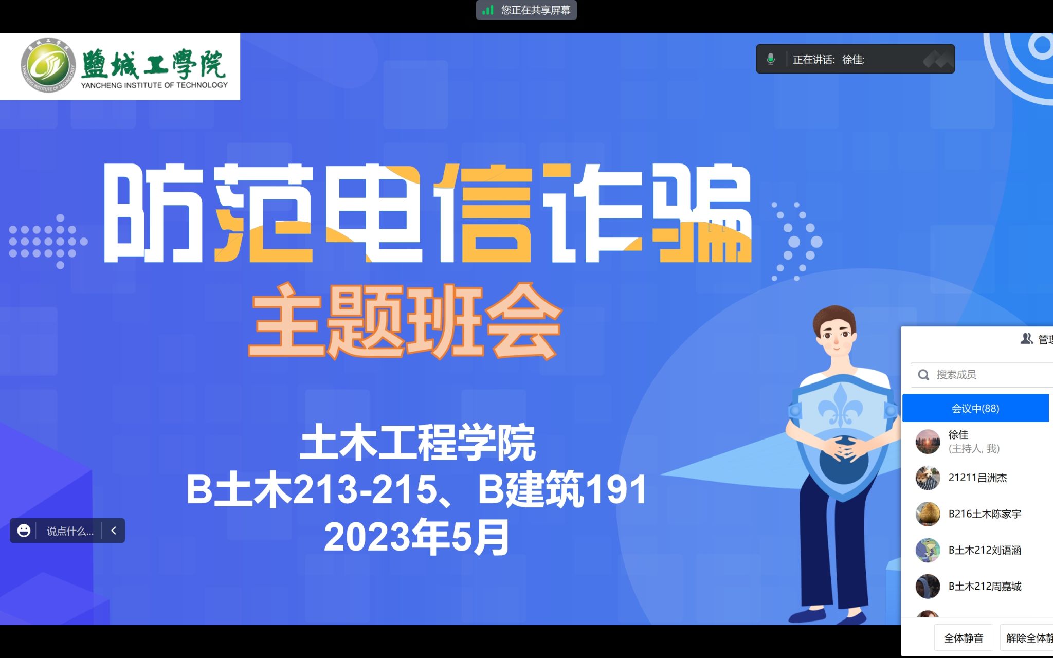 为提高学生防范电信诈骗意识,切实提高广大学生对电信诈骗犯罪的识别和应对能力,自觉抵制非法校园贷,净化校园环境,维护师生的合法权益。5月23-25日,土木工程学院全体专兼职辅导员以责任班级为单位,分别在希望大道校区和建军东路校区召开防范电信诈骗主题班会。