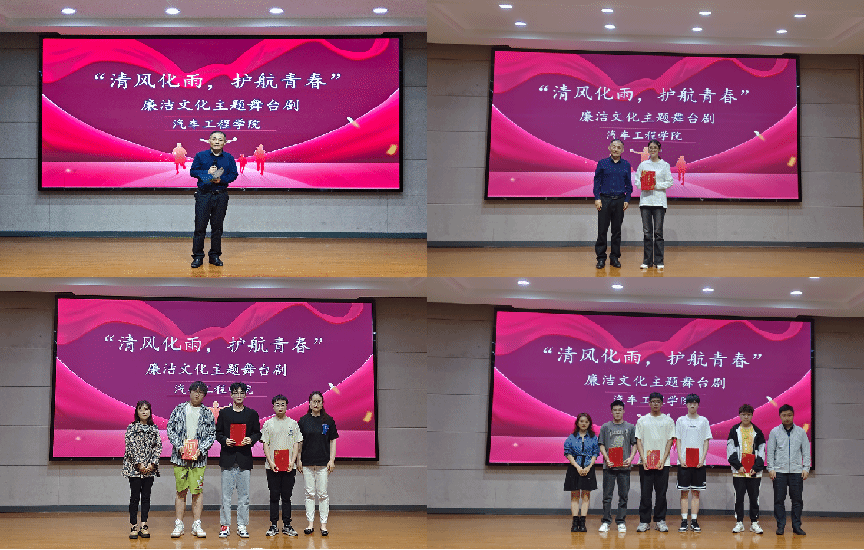 为加强学生廉洁教育,帮助学生在学习与工作中扣好人生“第一粒扣子”。5月28日下午,汽车工程学院在机械馆报告厅举办“清风化雨,护航青春”主题廉洁文化舞台剧大赛。纪委办公室主任陶应军,马克思主义学院副院长赵迎华,学院党总支副书记姜华,校宣传部新闻宣传科科长江莹,学院学工办主任吴慰春受邀担任此次活动评委。本次活动共40余名同学参演,200余名学生观看。