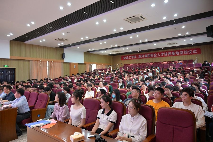 为提高人才培养质量,进一步推动产教融合,为学院学生搭建高质量实践平台,6月1日下午,盐城工学院、森风集团产教融合人才联合培养大会在我校希望大道校区机械馆报告厅成功举行。森风集团董事长沈峰、总裁张秀成、董事长助理李洋,汽车工程学院党总支书记杨军、党总支副书记姜华、院长助理郑竹安出席仪式。会议由副院长熊新主持,学院200余名师生参加。