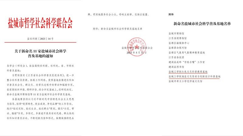 近日,盐城市社科联印发了《关于新命名11家盐城市社会科学普及基地的通知》(盐社科联〔2023〕14 号)。我校马克思主义学院申报的“盐城工学院红色文化科普教育基地”、设计艺术学院申报的“盐城工学院海盐文化传承与创新设计科普基地”获批盐城市社会科学普及基地,是我校首次获批盐城市社会科学普及基地。