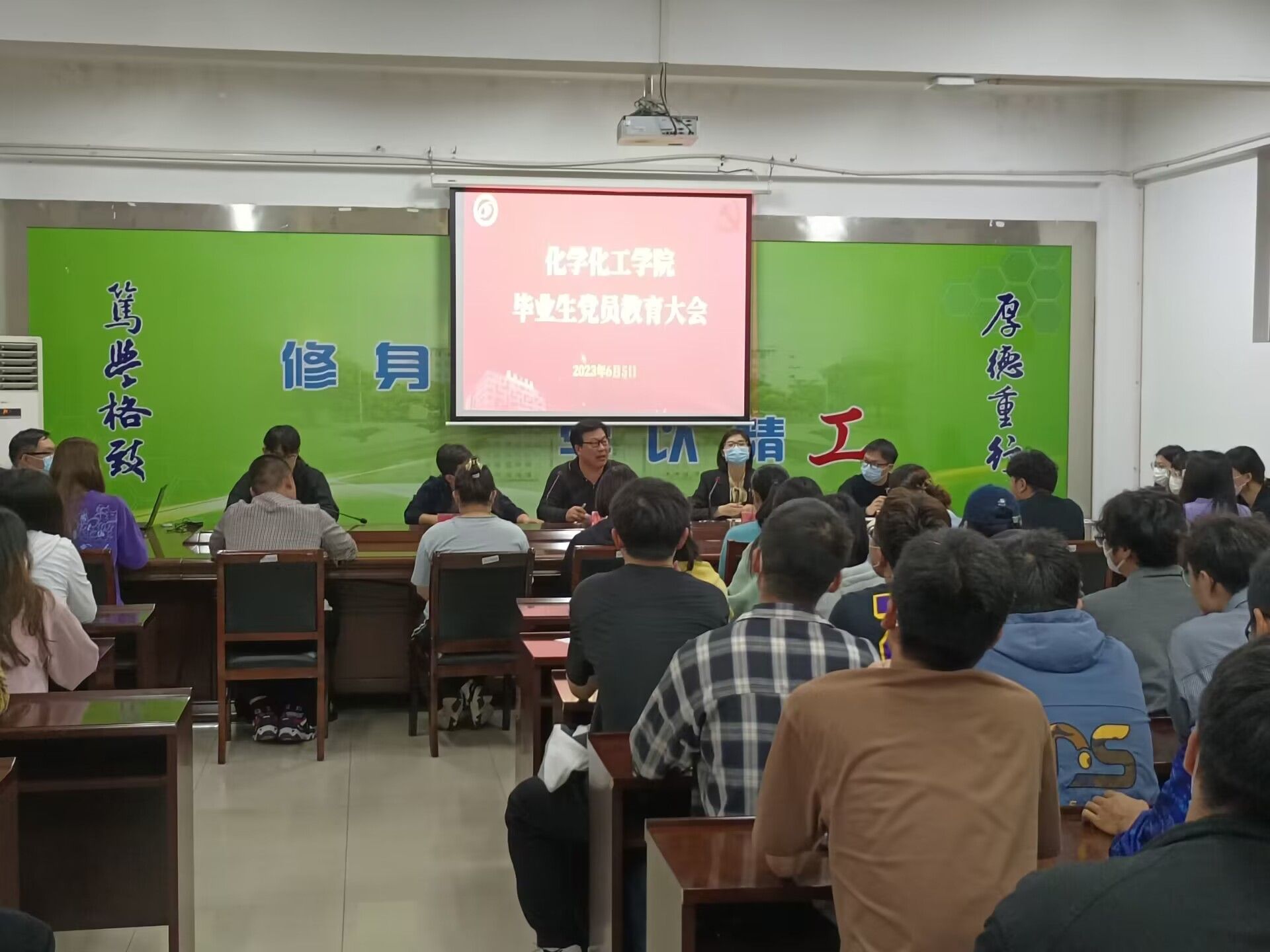 为进一步强化毕业生党员责任意识,激发毕业生党员使命担当,6月5日,化学化工学院在学院会议室召开全体毕业生党员教育大会。学院党委副书记江滔为毕业生党员上离校前的最后一次党课。会议由学工办主任李慧主持,学院团委副书记王灿星、各学生支部书记和全体毕业生党员等一百余人参加。