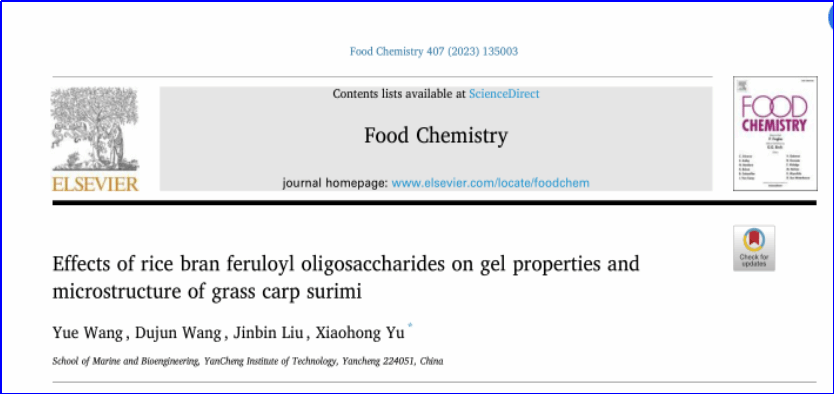 近日,海洋与生物工程学院2023届研究生王悦同学为第一作者在食品领域高水平期刊《Food Chemistry》(中科院1区,IF2021 = 9.231)发表题为《Effects of rice bran feruloyl oligosaccharides on gel properties and microstructure of grass carp surimi》的研究论文。研究生导师余晓红为通讯作者,海洋与生物工程学院为第一作者单位和通讯作者单位。