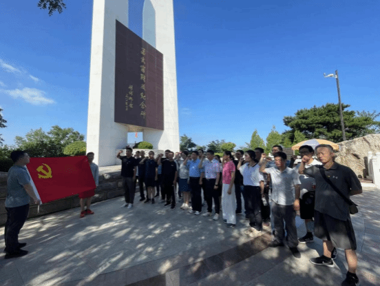 在纪念碑前,党员们集体重温入党誓词。大家整齐排列,面向鲜红的党旗,高举右拳,齐肩握拳,用庄严和奋进的誓词再一次向党表达了自己的忠诚和热爱,再一次许下对党忠诚、永不叛党的诺言。