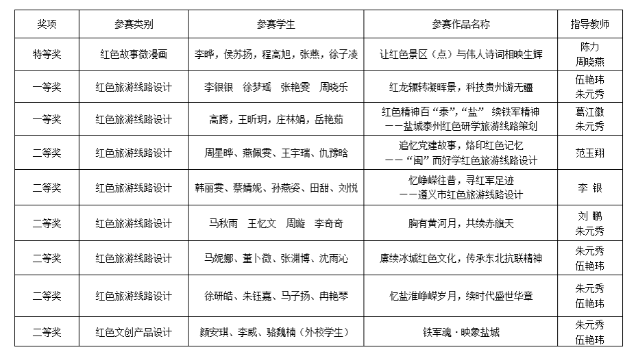 近日,第十三届全国大学生红色旅游创意策划大赛初赛获奖及入围决赛(线上环节)名单公布。本次比赛共有9支团队突破重围,在初赛中获奖。其中,1支队伍获特等奖,2支队伍一等奖,6支队伍获二等奖,获奖等级和数量均创专业历史新高。获特等奖的队伍入围决赛,将参加下一阶段的全国赛。
