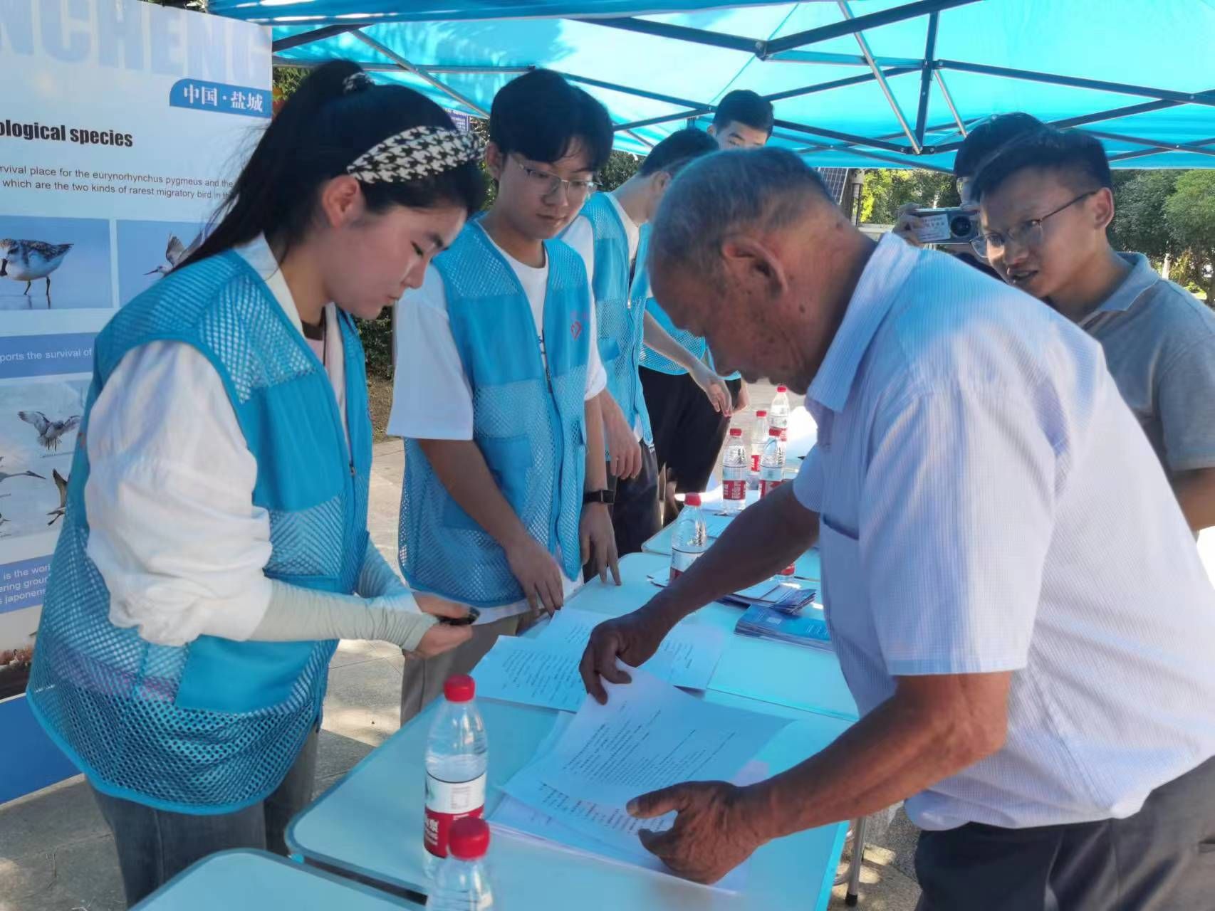 在鹿鸣社区广场,实践团成员布置了精心制作的展示盐城湿地之美的展板,并发放了宣传湿地保护、水资源利用、绿色出行等生态环保知识的彩页。同学们认真回答了现场群众的疑问,以图释法、以图普法,让群众通过身边的生态环境了解环保知识,呼吁群众自觉践行生态文明理念,共建美丽宜居家园。实践团队成员还现场发放了湿地保护调查问卷,进一步了解社区居民对湿地保护的认知程度,旨在通过科普读物、创意视频、开展志愿服务等方式,积极营造出生态环保的良好风尚,维护大美盐城的良好形象。