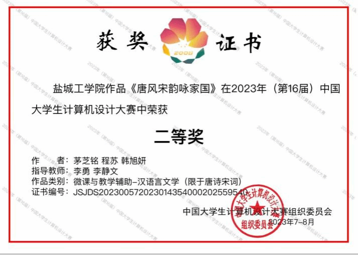 我校设计艺术学院参赛作品《唐风宋韵咏家国》荣获微课与教学辅助赛项全国二等奖。该作品由设计艺术学院教师李勇、李静文指导,视觉传达专业2021级茅之铭、程苏、韩旭妍三名同学共同完成。