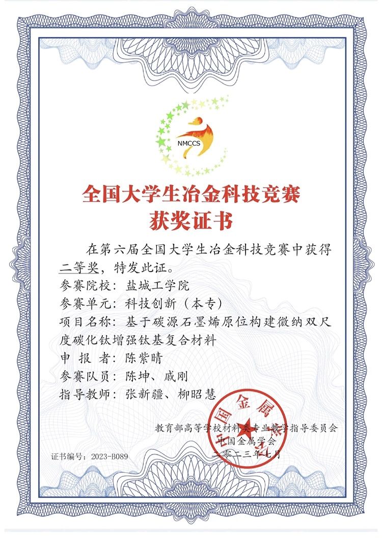 近日,第六届全国大学生冶金科技竞赛组织委员会公布了总决赛结果。我校材料学院本科生陈紫晴、陈坤和戚刚在教师张新疆、柳昭慧指导下,完成的科技创新作品《基于碳源石墨烯原位构建微纳双尺度碳化钛增强钛基复合材料》获全国总决赛二等奖。